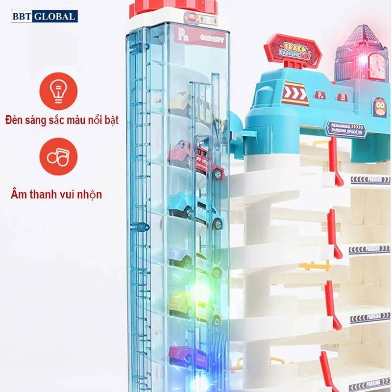 Với chiều cao ấn tượng và cấu trúc 5 tầng bãi đỗ, bộ đồ chơi mô phỏng một tòa nhà gara hiện đại như ngoài đời thực. Hệ thống đường ray xoắn ốc cực mượt giúp các xe ô tô mini trượt từ tầng cao nhất xuống sảnh chờ một cách ngoạn mục.