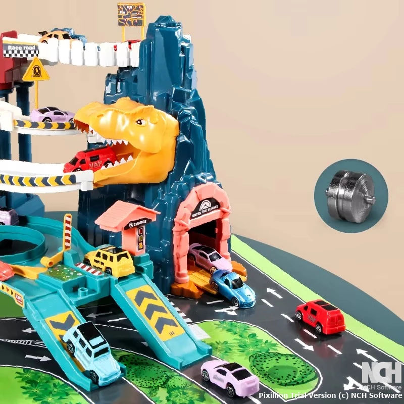 Sản phẩm được thiết kế theo dạng đường ray đa tầng, uốn lượn xuyên qua các hang động khủng long. Đặc biệt, hệ thống cần gạt tại các nút giao cho phép bé điều chỉnh hướng chạy của xe. Điểm này giúp bộ sỉ đồ chơi này có tính tương tác cao, không gây nhàm chán như các loại đường ray cố định.