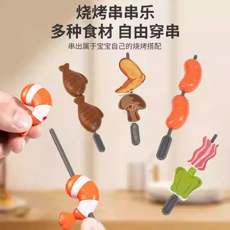 • Phụ kiện đa dạng: Gồm 14 loại thực phẩm (thịt xiên, tôm, rau củ…), 4 chai gia vị, bộ dụng cụ nấu ăn (kẹp gắp, xiên que), ly nước và đặc biệt là bộ tiền đồ chơi mô phỏng giao dịch mua bán.