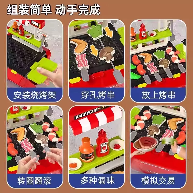• Phụ kiện đa dạng: Gồm 14 loại thực phẩm (thịt xiên, tôm, rau củ…), 4 chai gia vị, bộ dụng cụ nấu ăn (kẹp gắp, xiên que), ly nước và đặc biệt là bộ tiền đồ chơi mô phỏng giao dịch mua bán.